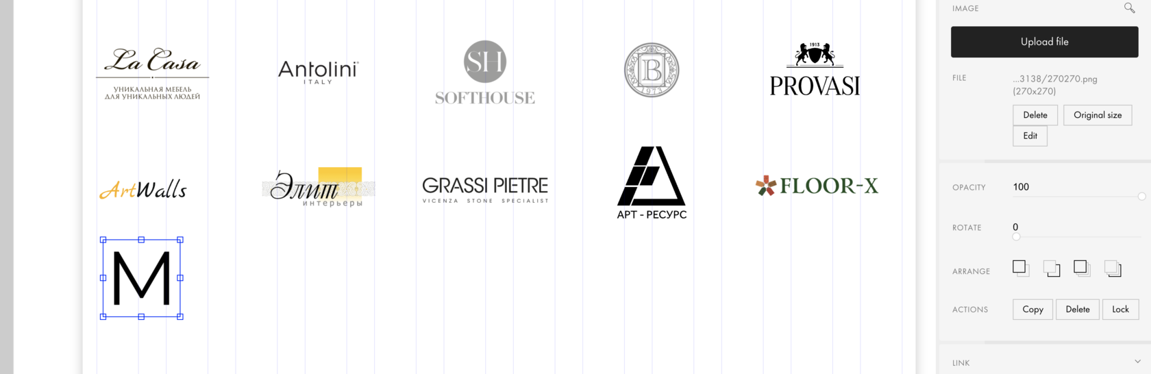 Для того чтобы добавить новый логотип, нажмете кнопку "+" слева в верхнему углу и выберете пункт "Add Image" После чего появится серый квадрат в верхнем левом углу в поле контента